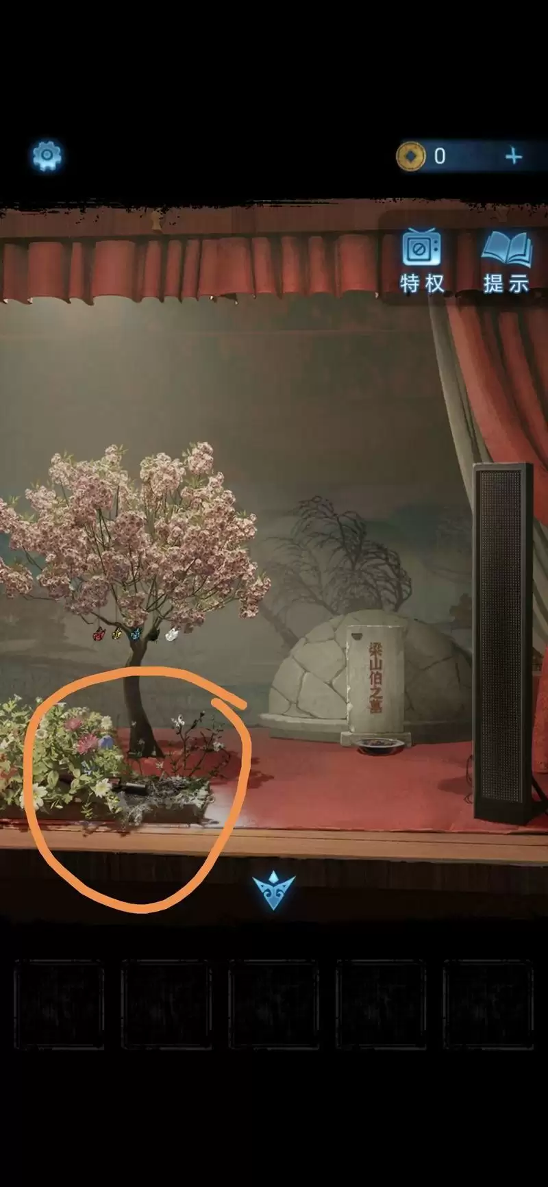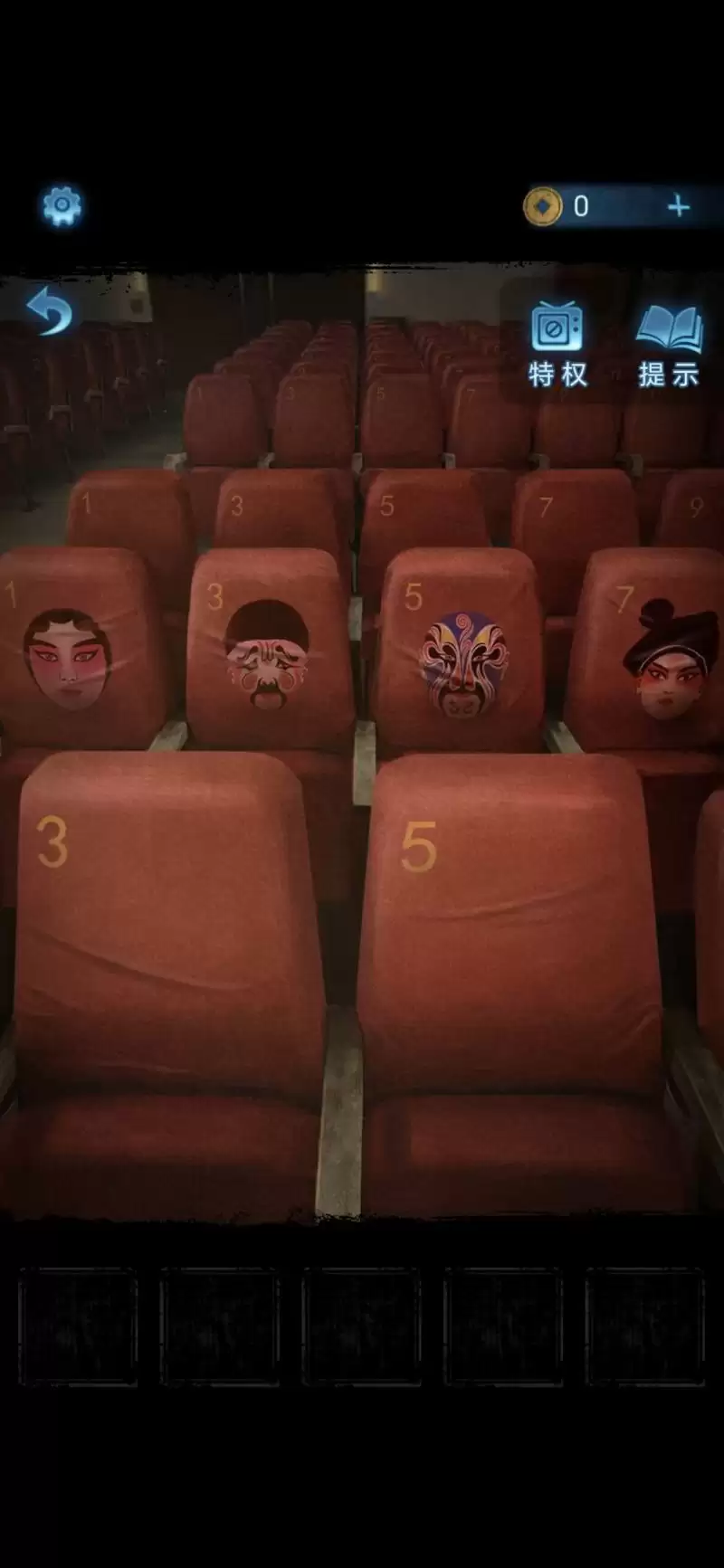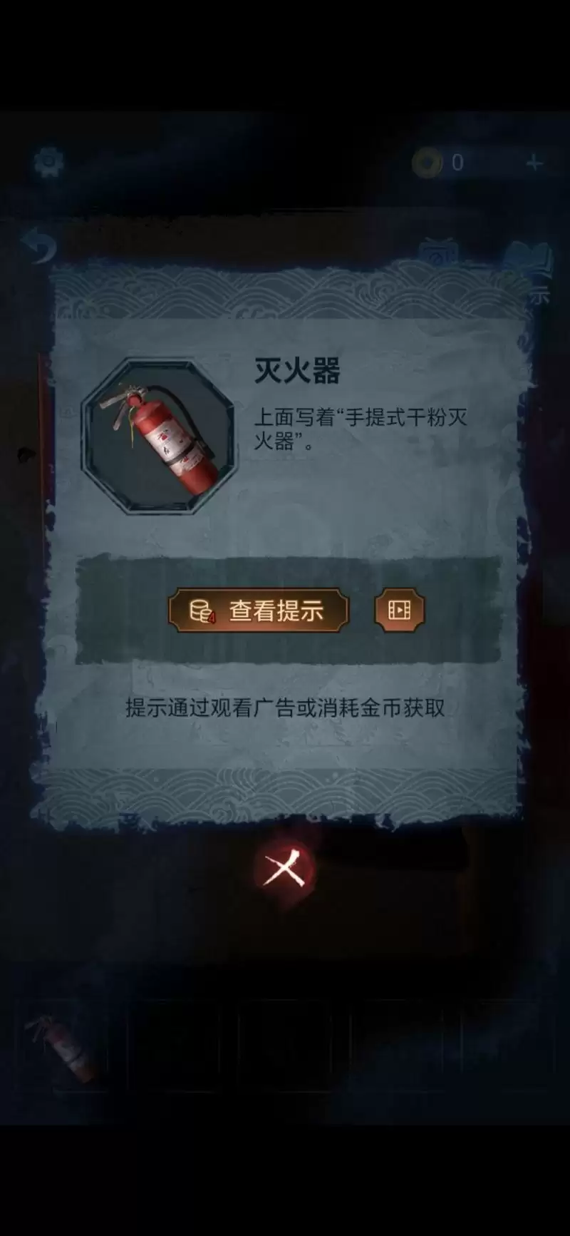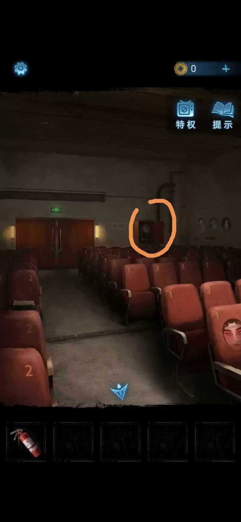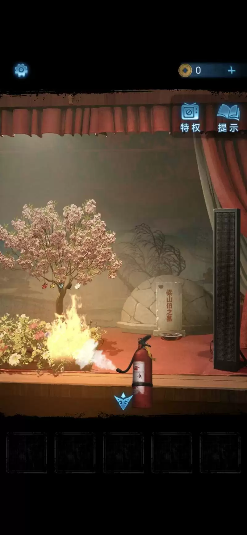 然后戏台着火,点击座椅位置查看椅背数字,解开消防栓上的锁,点击获得灭火器