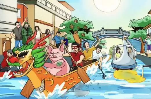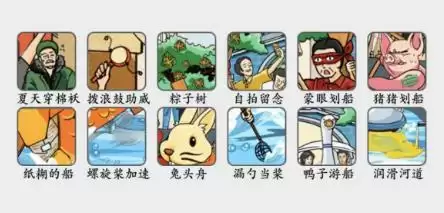答案:【夏天穿棉袄、拨浪鼓助威、粽子树、螺旋浆加速、纸糊的船、免头舟、自拍留念、漏勺当浆、蒙眼划船、鸭子游船、猪猪划船、润滑河道】