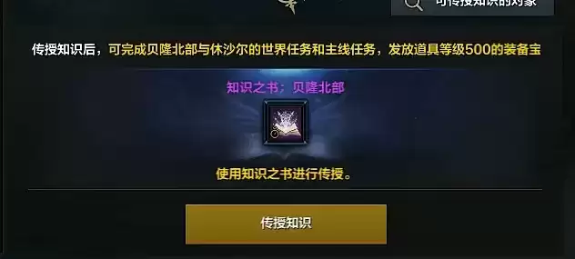 2、使用传授知识获得的装备箱叫做“贝隆北部知识传授装备箱子”,可以获得一套500级别的缘分套装。