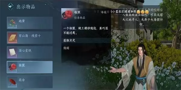 2、接着我们就把NPC需要的物品出示给他,并且完成对话之后,就可以获取到【妆匣】的奖励。