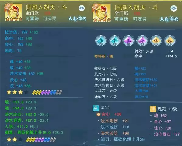 这件【归雁入胡天·斗】洗出来的大部分都是输出词条,424点法攻作为基础,547.75点会心与441点命中可以进一步拉高我的输出威力,另外还有法穿、法术破防等词条的帮助,让我在竞技场上能够更加游刃有余。