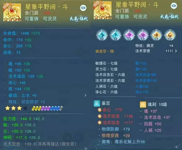 比如这件【星垂平野阔·斗】,总共洗出了641点法术攻击、491点命中和554.5点诛心,保证了我的输出能力。同时还有被动技能【止水】,以及生命值、神明等防御属性的加成,让我在战场上有更好的生存空间,可以专心进行输出。