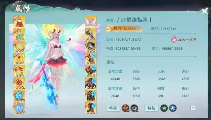 我的战力有655353,其中最满意的是法攻,共有13440点,奠定了出色的伤害基础;再配合7730点会心、3048点法穿和7398点命中,我的输出以及爆发能力就比较高了。针对pvp玩法,我还堆了1325点诛心和1242点人祸,在与对手交战时可以打出更高的伤害。