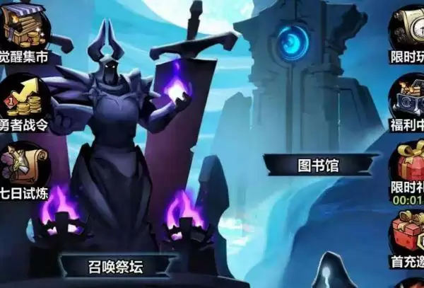 该选项位于游戏界面下方的一栏玩法中的第一个选项,进入后首先解锁的是功能是召唤祭坛,玩家可以通过召唤卷轴或火柴来进行英雄的招募,每积攒一定的召唤次数就会有一次必出五星英雄的召唤,使玩家们作战英雄的主要由来之地,目前十连抽仍在打折阶段,比较划算。