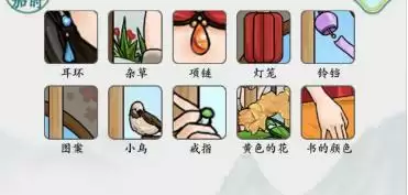 【耳环、杂草、项链、灯笼、铃铛、黄色的花、书的颜色、图案、小鸟、戒指】