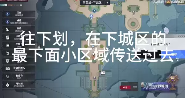 2、到达莱茵城之后,打开莱茵城的地图,往下滑动地图,找到下城区最下面的区域过去,如下图: