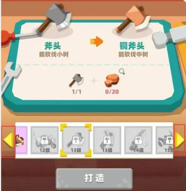 工具台打造,列表往后划到铜斧头位置,在13级解锁