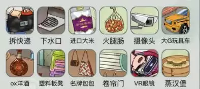 答案:【拆快递、下水口、进口大米、火腿肠、摄像头、大G玩具车、ox洋酒、塑料板凳、名牌包包、卷帘门、VR眼镜、蒸汉堡】