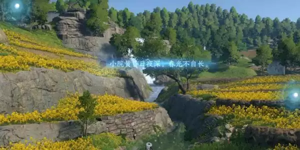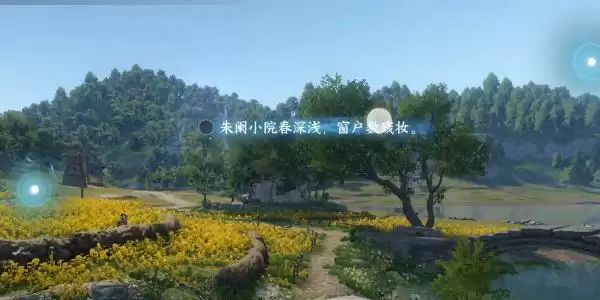2、随游戏镜头往前延伸我们点击中间光点以小院做游意象写出第一句(小院黄昏日夜深,春光不自长。)。