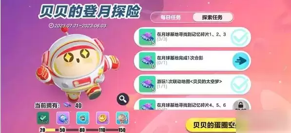 蛋仔派对在月球基地完成一次合影任务怎么做。贝贝的登月探险活动开启,玩家需要完成任务获取奖励,本期为大家带来的是在月球基地完成一次合影任务完成攻略,一起来看看吧。