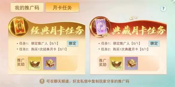 同时,月卡系统还新增推广码功能和月卡首购任务。将推广码分享至其他少侠并完成绑定后,被分享人首购月卡时,即可获得绑元和推广礼包奖励,推广礼包有机会开出天域琉璃、大禹之灵、异兽魂元等珍贵道具!每位少侠每月最多可获得6次月卡推广奖励。完成经典月卡和典藏月卡的首购任务,即可领取额外的元宝和金币奖励!