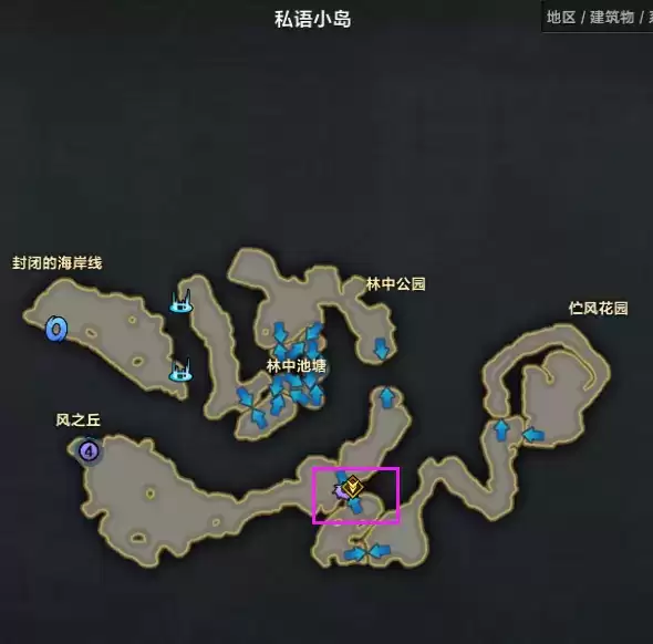 1、在阿尔忒弥斯大陆左侧的私语之海中,我们可以看到一个叫做私语小岛的地点。