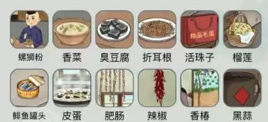 【螺狮粉、鲱鱼罐头、香菜、皮蛋、臭豆腐、折耳根、活珠子、肥肠、辣椒、香椿、榴莲、黑蒜】