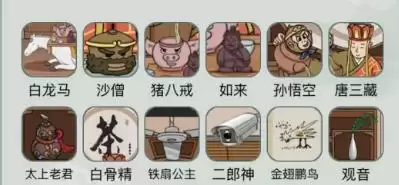 【白龙马、太上老君、沙僧、猪八戒、如来、孙悟空、唐三藏、白骨精、铁扇公主、二郎神、金翅鹏鸟、观音】