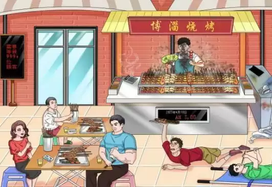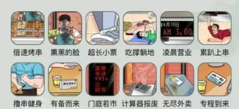 【无尽外卖、专程到来、门庭若市、有备而来、撸串健身、凌晨营业、倍速烤串、熏黑的脸、计算器报废、累趴上串、吃撑躺地】