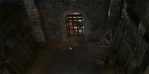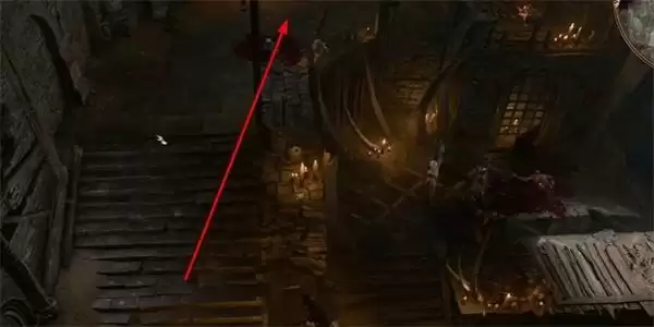 2、接着我们就进入到此房间当中,按照标记的路线走到楼梯上,就可以看到一扇大门。