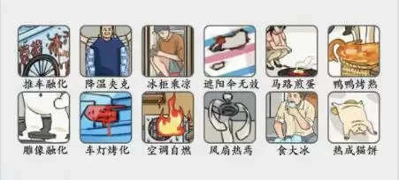 【推车融化、降温夹克、冰柜乘凉、遮阳伞无效、马路煎蛋、雕像融化、车灯烤化、食大冰、空调自燃、风扇热焉、鸭鸭烤熟、热成猫饼】