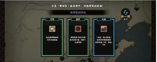 军团打下要地后,会获得威名经验,用来提升威名等级提升,就可以获得更多增益。同时,如果对于当前的增益效果不满,可以消耗军团用间等级,利用右上角的刷新功能进行刷新。