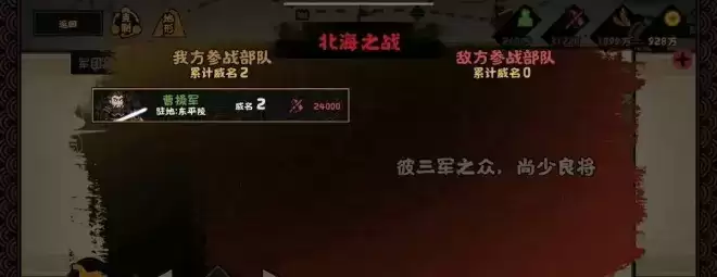 如下图所示,当我使用初始士兵进攻治所北海时,驻扎在附近要地的曹操军团会提供威名等级buff,同时,我方也可使用对应军团中的武将进行进攻。