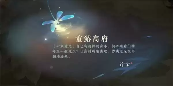 1、玩家需要游故地,进入到高府当中,与门卫进行对话即可,接着进入当中,被门卫给拦截住了,就开始回忆当初进入到高府的样子。