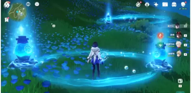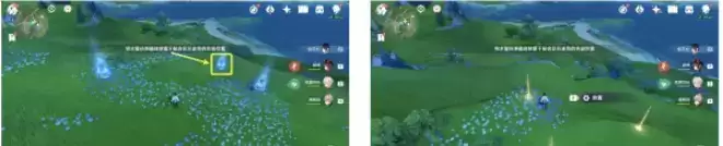 (2)再拾取3个水种子,配合①中的机关,即可同时点亮周围的三个水量侦测晶体,完成解谜。