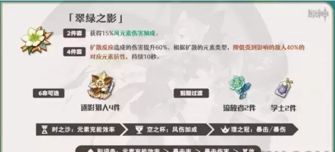 作为当前版本唯一具有荒性攻击的角色,琳妮特可以直接搭配翠绿之影4件套配合触发扩散反应,加入相关反应队伍中担任辅助。