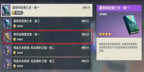 3、接着我们就可以在书籍里面看到枫丹动物寓言集卷一,进行购买之后,就可以获得到了。