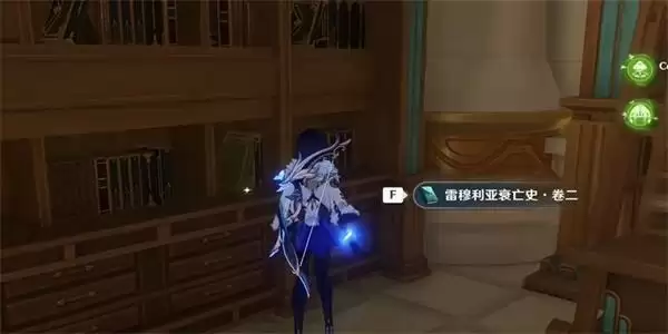 3、接着我们前往到沫芒宫正前方的桌子,然后在左手边的柜子上面,就可以看到雷穆利亚衰亡史卷二。