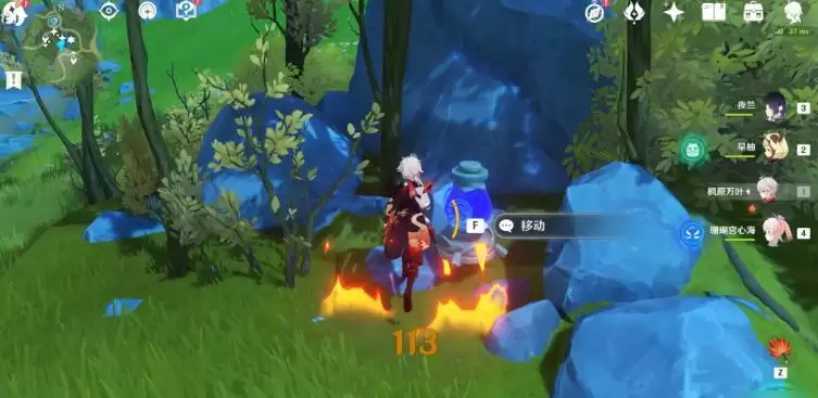 6、然后打碎琥珀,等水种子出现,使用水元素角色释放技能,增加水种子可以转变成水之核,把火把熄灭;