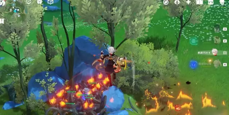 1、首先要使用火元素烧掉藤蔓,也可以使用风元素扩散旁边的烈焰花;