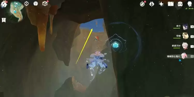 4、然后就会自动传送到如下图位置,抬头就可以往上面游,到水面;