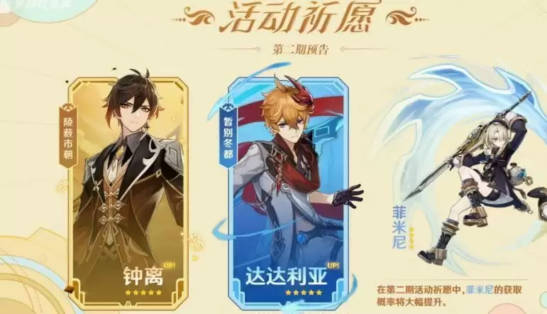 下半卡池:钟离(五星)、公子(五星)、菲米尼(四星)