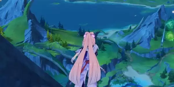 3、来到高处后我们想下跳,朝着左侧的七天神像位置靠近,中途降落到地面。