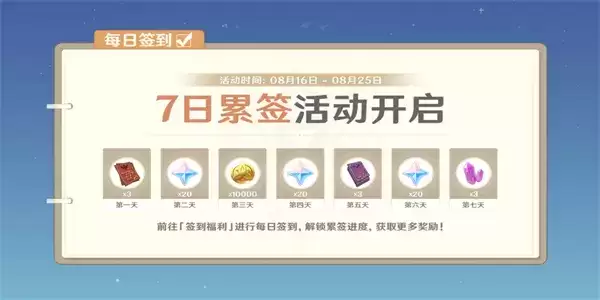 1、活动期间,在米游社进行签到福利完成每日签到,可额外获得对应累计签到天数的奖励。