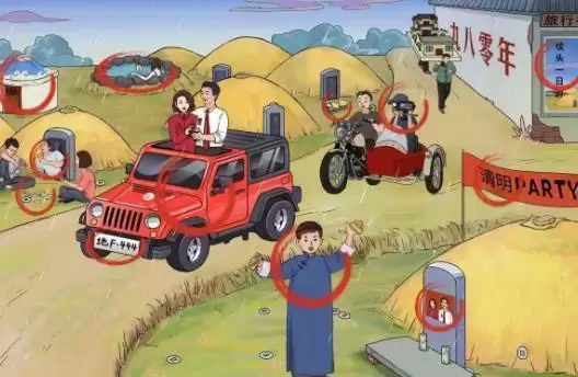 2、接着我们就可以在画面上看到蒙古包、坟地旅游、清明派对、专业摄像、烧烤贡品等不合理的答案。