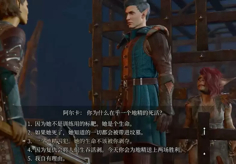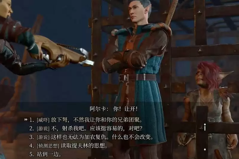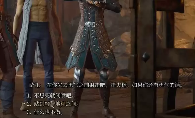 2、然后我们会进入选择,如果想要解救萨扎的话,选择【站到弩与地精之间】即可。