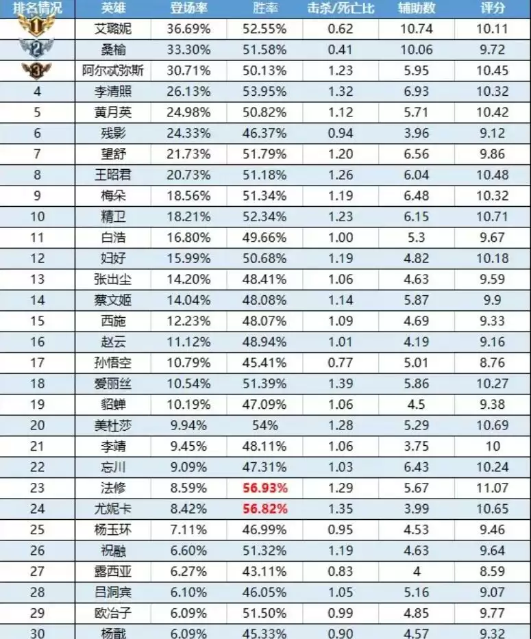 登场率前五:艾璐妮、桑榆、阿尔忒弥斯、李清照、黄月英
