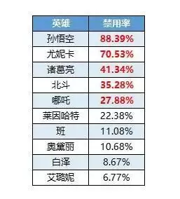 3、被禁率前5的英雄为孙悟空、尤妮卡、诸葛亮、北斗、哪吒,这些英雄大多有着十分恶心的机制,让人不得不去禁用他们。