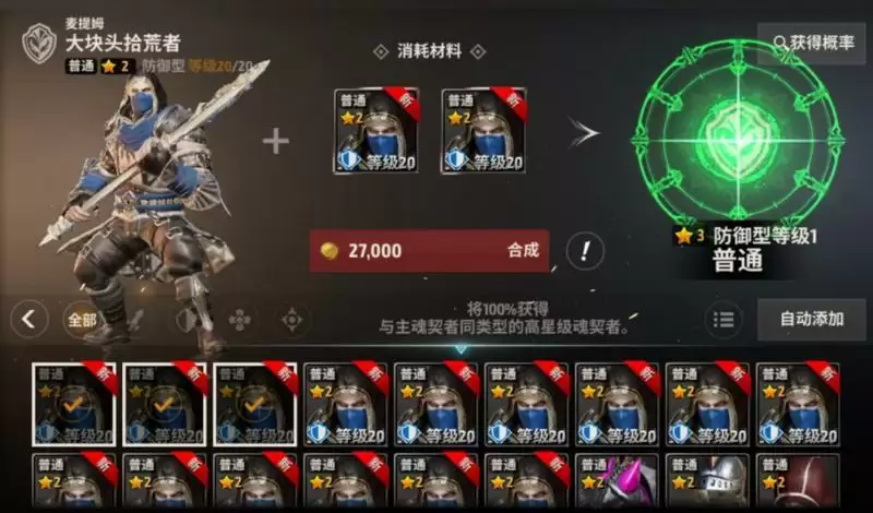 消耗一定金币点击[合成]按钮后,可以随机得到更高一星级、同主材料类型的任意魂契者。在界面右上角可以点击查看得到各种魂契者的概率。