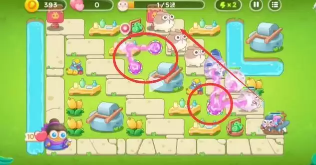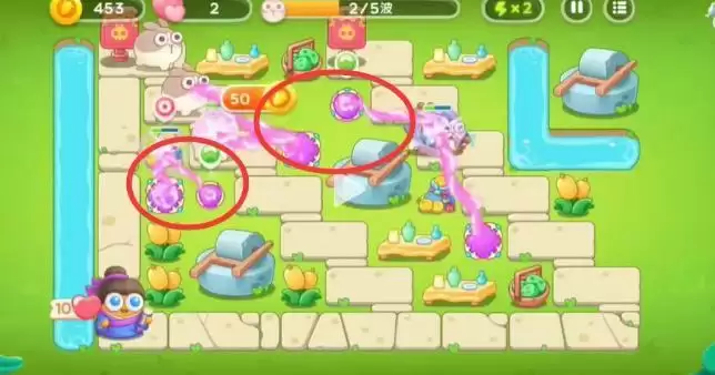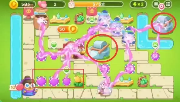 5、最后一波兔子会从左边出来,在荷叶上多放置几个魔法球。