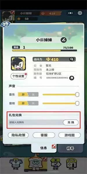 3、我们进入到个人信息页面之后,就可以看到【礼包兑换】的输入框,我们把获取到的兑换码输入进去。