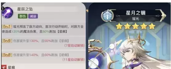 瑶光为首充赠送角色,这里大家可以购买新手六元礼包也可以领取首充奖励~瑶光的起手技能为全体AOE,虽说是AOE伤害,但它的倍率直逼很多角色的大招伤害,所以就相当于开局起手就是一发全体的高额伤害(而且还自带几率减速),在第二回合时可以非常好的配合安纳塔进行残局收割,如果你能在前期抽到一只瑶光的话,那么恭喜你,作为三星瑶光开局的你来说,就拥有了越级挑战的资格