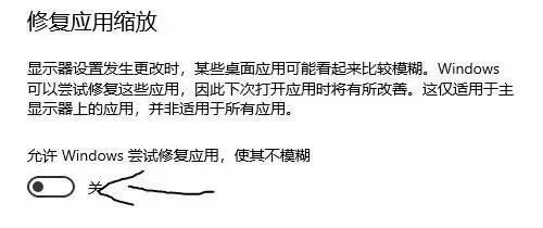 3、之后在【修复应用缩放】中,关闭允许windows尝试修复应用即可。