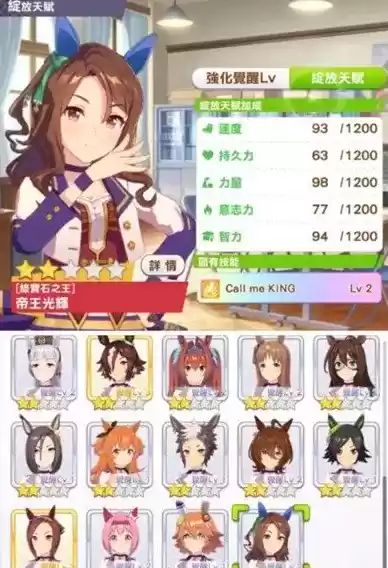 帝王光辉是比较少的适合居中跑的短距离的赛马娘,选择帝王光辉进短距离的队伍,并不是为了争取第一,而是留在比赛中对其他的赛马娘造成干扰,帮助队伍中樱花蓦进王或者真机灵取得胜利。不过帝王光辉的培育难度比较高,她的培育目标有太多种类的比赛要跑了,所以很难培育成高速度的短距离赛马娘。