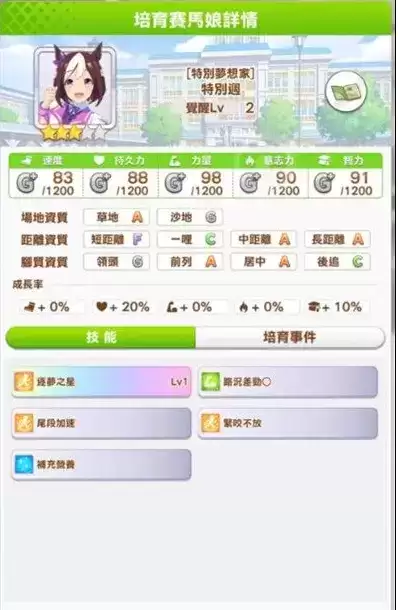 特别周的培育目标全是中长距离的比赛,而且自身的距离资质也是中长距离双A, 所以要特别注意速度和持久力。要跑通URA的话可以以速700 持久力600为目标进行培育。如果想选择居中战术跑URA的话,还需要提升力量。如果是为了竞技场进行培育的话,这三个属性的要求会更高。