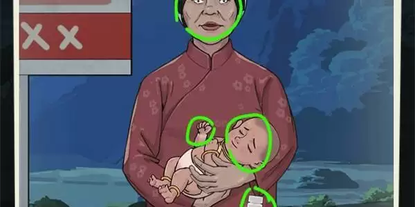 疑点2、第二个疑点画面是一个中年妇女,首先我们就可以看到女人的脸很慌张、口袋中药、口袋中手机、宝宝的脸,我们需要下滑宝宝襁褓露出消失的手镯,还是选择不开门。