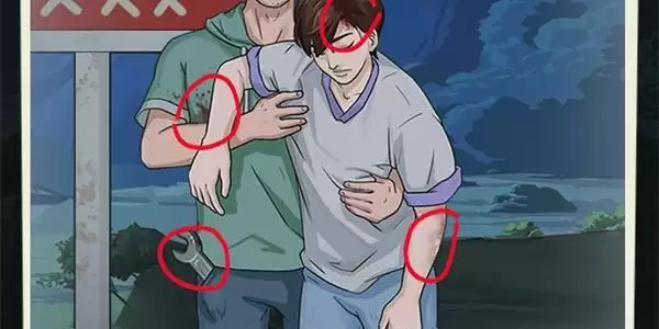 疑点1、首先我们进入到游戏关卡当中,就可以看到牌子下的两个男生,我们可以这两个男生身上找到头上的伤口,诡异的瘢痕,身上破裤子,身上血迹,裤子口袋中扳手,然后我们就选择不开门即可。