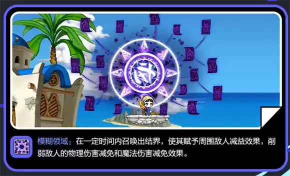 5、技能“模糊领域”:召唤结界减免敌人的物理伤害和魔法伤害,结界持续一段时间。