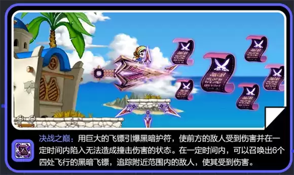 4、技能“决战之巅”:引爆黑暗护符,减免敌人伤害,并召唤6个黑暗飞镖追踪敌人。