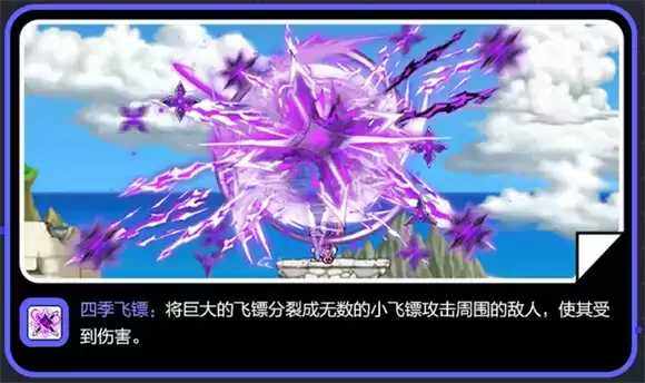 3、技能“四季飞镖”:将巨大的飞镖分裂小飞镖,打出群体伤害。